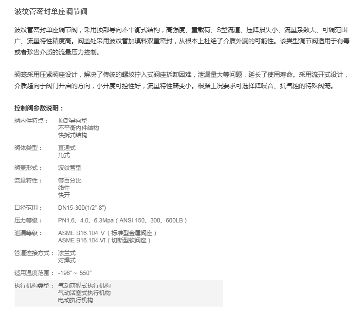 波纹管密封单座调节阀