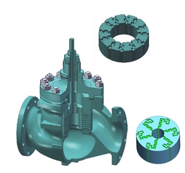 It is a balanced-type control valve, adopting a design that combines a labyrinth cage with a balanced spool. The labyrinth cage is composed of multiple cylindrical valve plates with labyrinth diameters distributed on coaxial surfaces. According to different medium process parameters, labyrinth cages with different labyrinth diameter specifications and stacking layer compositions are designed. The labyrinth cage divides the total flow path into many tiny, circuitous, and even step-distributed throttling flow paths, forcing the fluid to constantly change its flow direction and gradually reduce the fluid pressure as the flow area decreases. This achieves the prevention of cavitation and flashing, and prolongs the service life of the valve trim. By using a balanced cage spool, the tight fit between the spool and the valve seat ensures extremely low leakage. This kind of valve trim is suitable for various working conditions prone to blockage flow and cavitation.